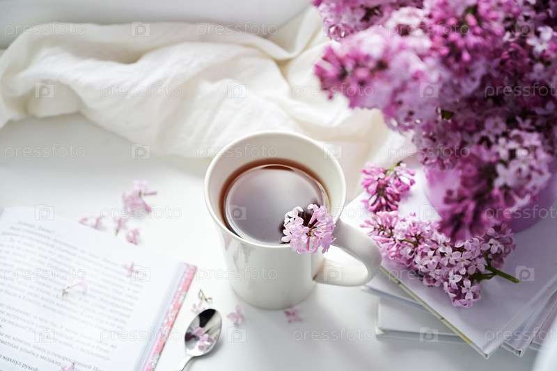 Открытка красивая. Кружка чая, старая книга и букет фиолетовой сирени. Красивый натюрморт. Весеннее время. Концепция доброго утра