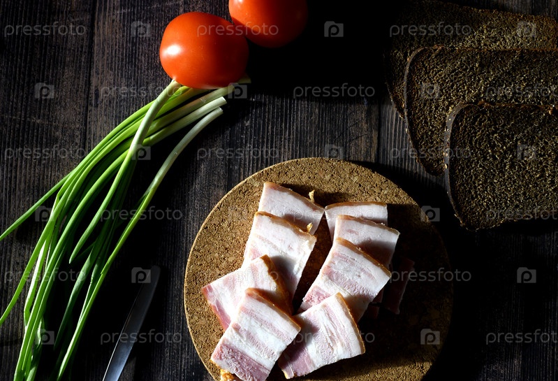 Сало с черным хлебом и зеленым луком на темном фоне, русская национальная еда