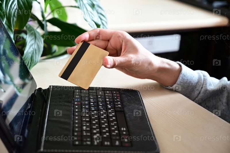 Руки держат кредитную карту и используют ноутбук. Онлайн покупки