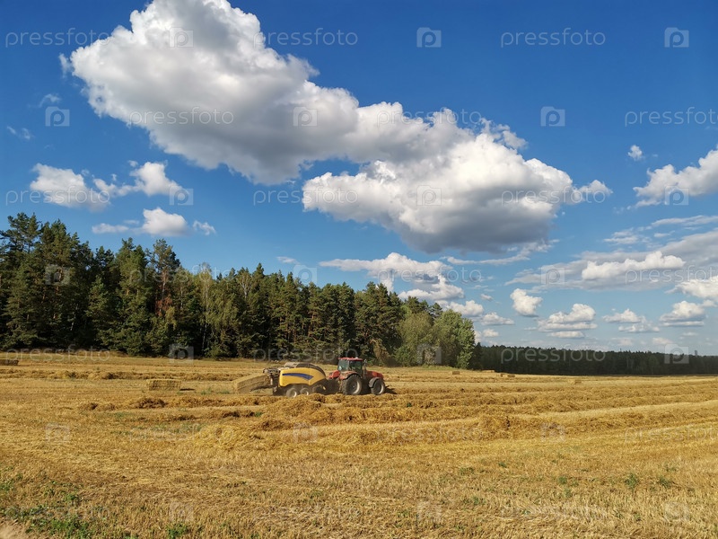Рулонный пресс-подборщик выгружает тюк свежей пшеницы