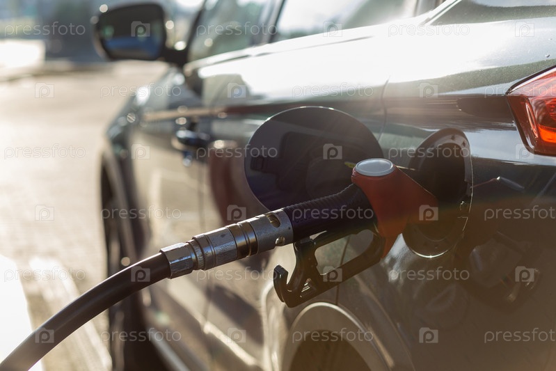 Топливная форсунка для заправки топливом в автомобиле на заправочной станции. Красная ТРК на сером автомобиле на АЗС