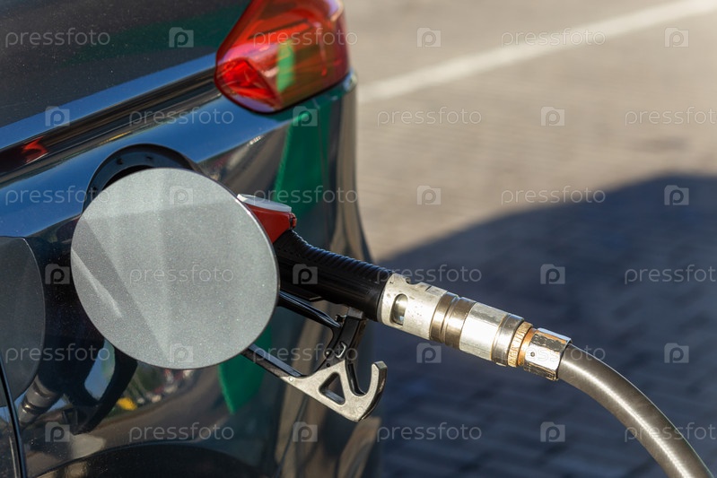 Топливная форсунка для заправки топливом в автомобиле на заправочной станции. Красная ТРК на сером автомобиле на АЗС