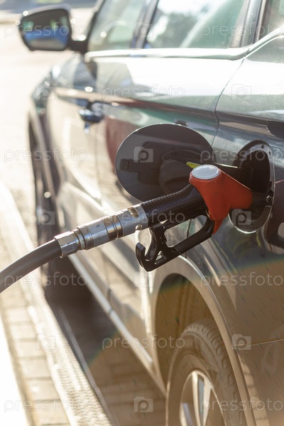 Топливная форсунка для заправки топливом в автомобиле на заправочной станции. Красная ТРК на сером автомобиле на АЗС