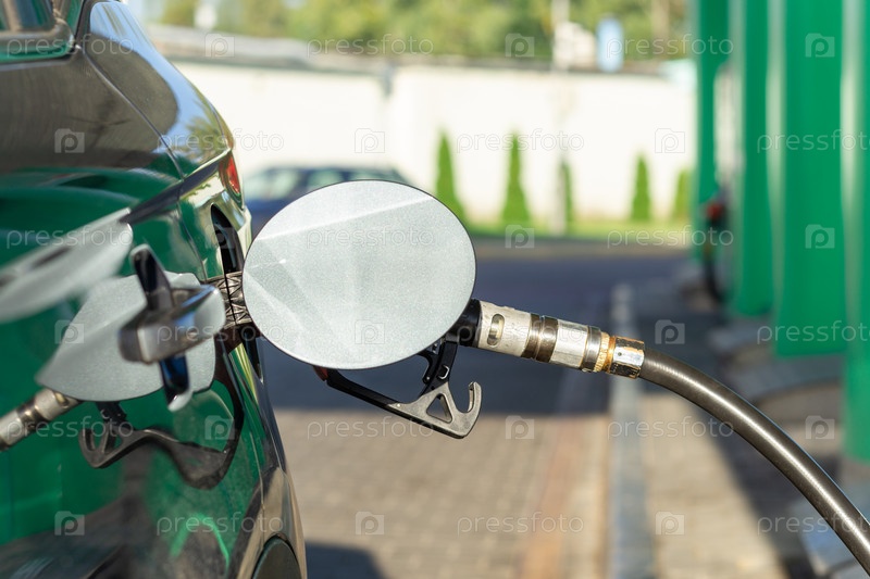 Топливная форсунка для заправки топливом в автомобиле на заправочной станции. Красная ТРК на сером автомобиле на АЗС