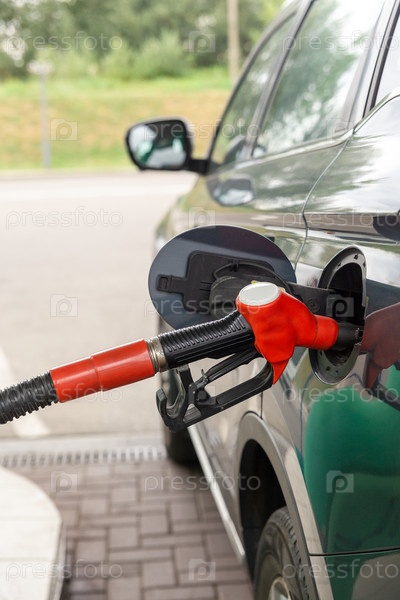 Топливная форсунка для заправки топливом в автомобиле на заправочной станции. Красная ТРК на сером автомобиле на АЗС