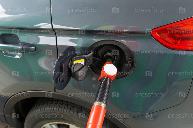 Топливная форсунка для заправки топливом в автомобиле на заправочной станции. Красная ТРК на сером автомобиле на АЗС