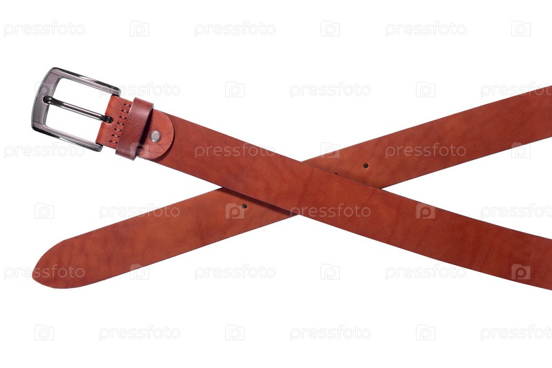 Изолирован скрещенный коричневый кожаный ремень с металлической пряжкой на белом фоне