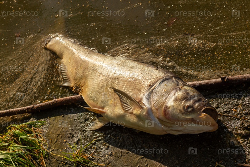 Мертвая гнилая рыба на берегу загрязненного озера. Рыба не выдерживает аномальной жары и погибает от недостатка кислорода