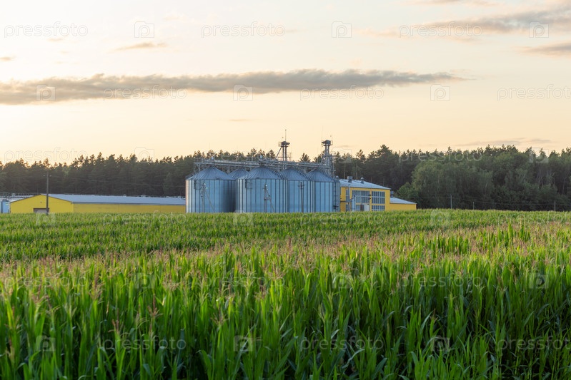 Современный амбарный элеватор и линия очистки семян на кукурузном поле. Серебряные силосы на агроперерабатывающем заводе для хранения и переработки сушки и очистки сельскохозяйственной продукции, муки, круп и зерна