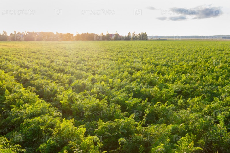Сельское хозяйство Беларуси, морковное поле летом, ряды растений, время заката