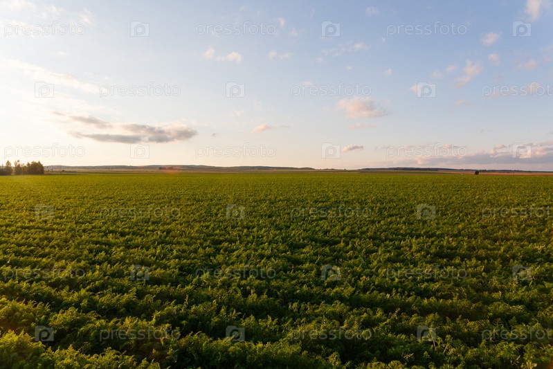 Сельское хозяйство Беларуси, морковное поле летом, ряды растений, время заката