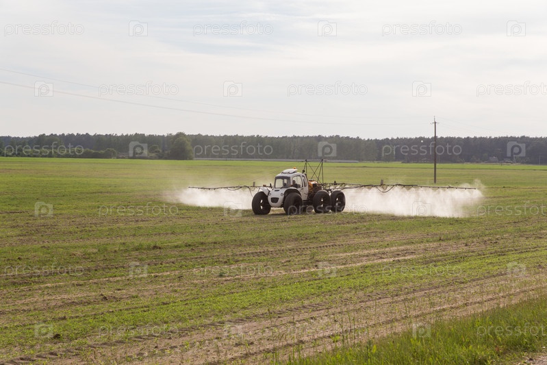 Трактор распыляет жидкие химические удобрения на кукурузном поле