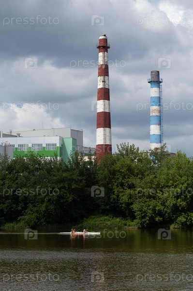 Спортсмены тренируются в каякинге по реке на фоне промышленного предприятия