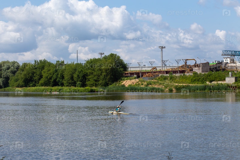 Спортсмены тренируются в каякинге по реке на фоне промышленного предприятия
