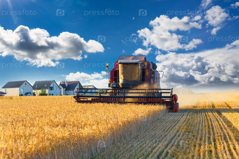 Комбайн работает на пшеничном поле
