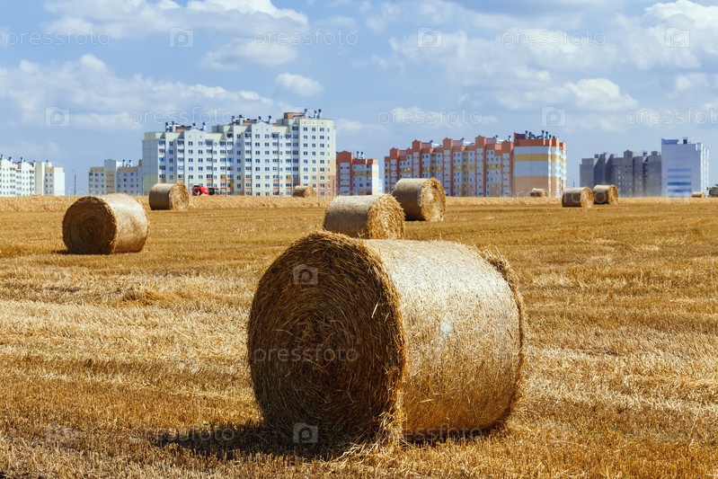Вид на широкое убранное поле с большими желтыми тюками соломы на городском фоне