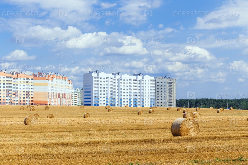 Вид на широкое убранное поле с большими желтыми тюками соломы на городском фоне
