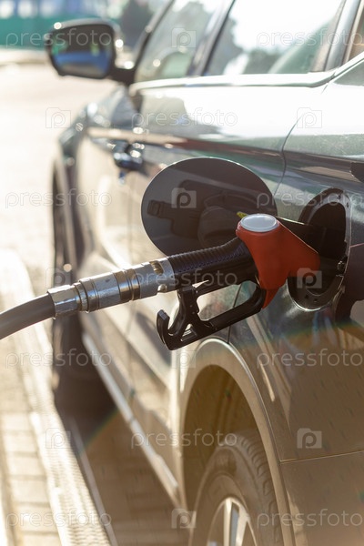 Топливная форсунка для заправки топливом в автомобиле на заправочной станции. Красная ТРК на сером автомобиле на АЗС