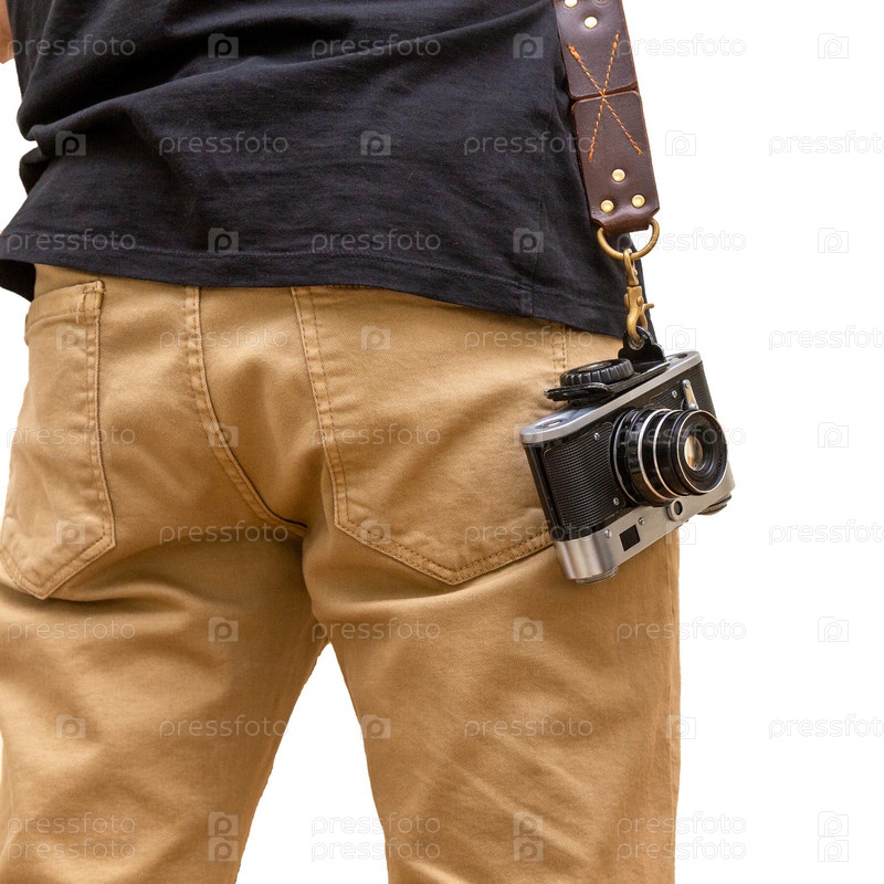 Мужчина стоит задом наперед с коричневым плечевым ремнем ручной работы из натуральной кожи, изолированным на белом фоне. Оборудование для фотографа, стильное, винтажное, ретро. Путь отсечения