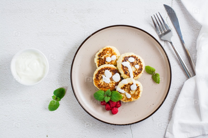 Блинчики с творогом со сметаной, малиной и мятой на тарелке на столе. Вид сверху