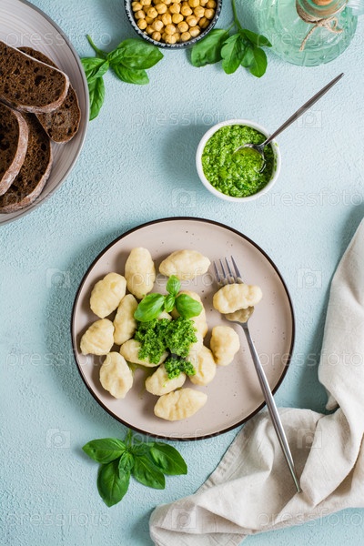 Картофельные клецки с соусом песто на тарелке. Итальянская традиционная кухня. Вид сверху и вертикальный