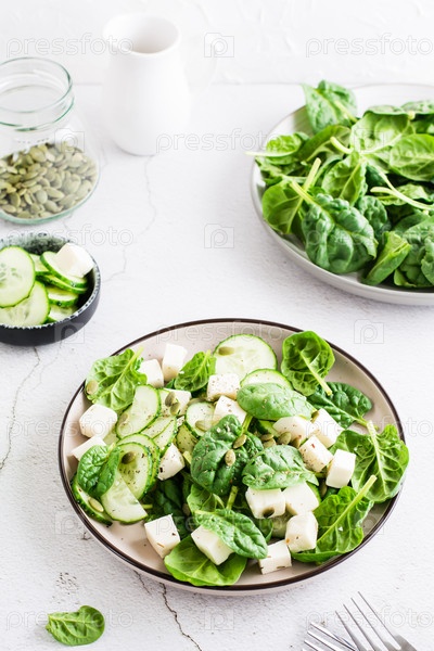 Свежий салат из огурцов, шпината, сыра и тыквенных семечек в тарелке. Вертикальный вид. Крупный план
