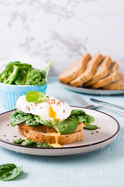 Аппетитная брускетта с яйцом-пашот и шпинатом на тарелке. Кето диета. Вертикальный вид