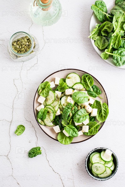Свежий салат из огурцов, шпината, сыра и тыквенных семечек в тарелке. Верхний и вертикальный вид