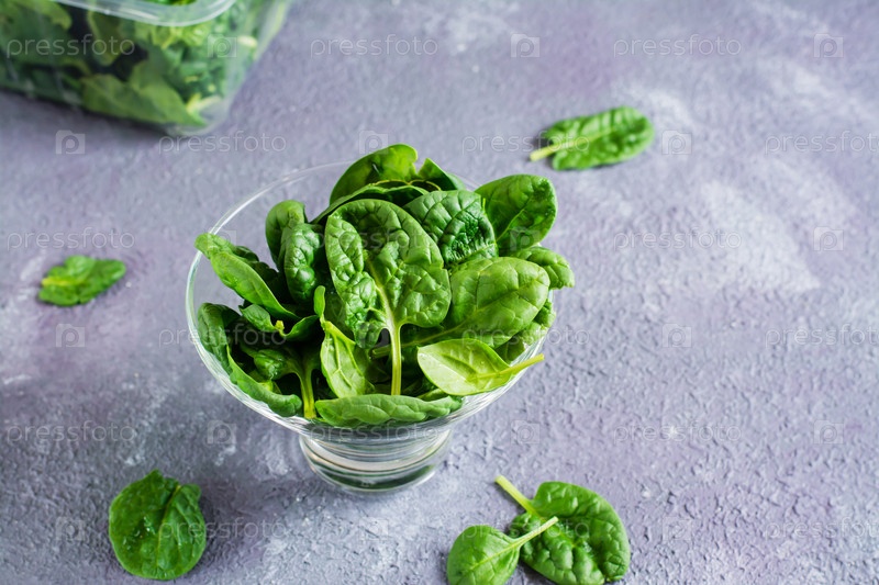 Свежие молодые листья шпината в стеклянной миске и позади на текстурном столе. Копировать пространство