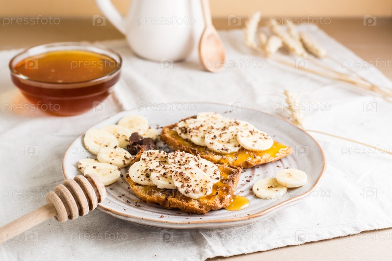 Готовые бутерброды с медом, бананом и шоколадом на тарелке на столе. Домашняя вегетарианская закуска