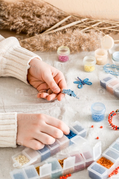 Руки девушки плетут дельфина на столе с предметами для бисероплетения. Развитие творческих способностей и мелкой моторики у детей. Вид сверху и вертикальный