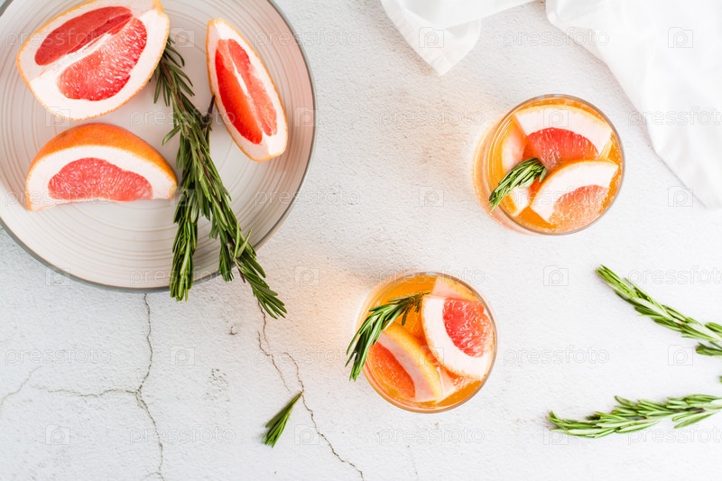 Освежающий грейпфрутовый коктейль с розмарином в стаканах на столе. домашний напиток. Вид сверху
