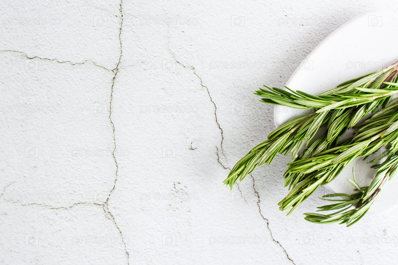 Веточки свежего розмарина на тарелке на столе. Органическая ароматическая трава для приготовления пищи и здоровья. Вид сверху. Копировать пространство