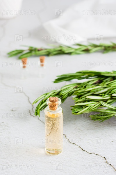 Бутылка эфирного масла розмарина и ветки трав на тарелке на столе. Органическое ароматическое натуральное средство. Вертикальный вид