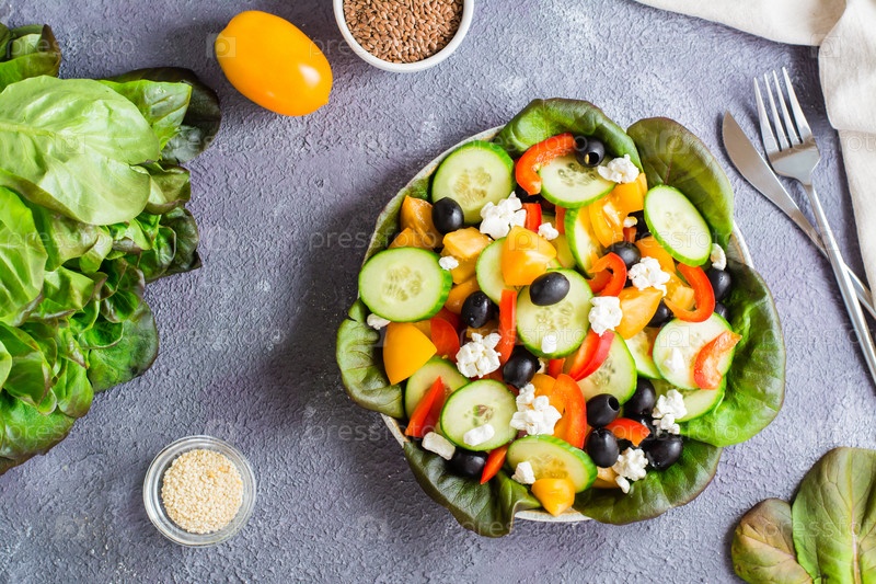 Греческий салат из помидоров, огурцов, перца, оливок, салата и сыра на тарелке. Вид сверху