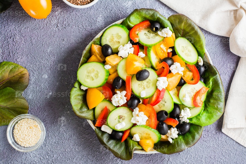 Греческий салат из свежих овощей, листьев и сыра фета на тарелке на столе. Вид сверху. Крупный план