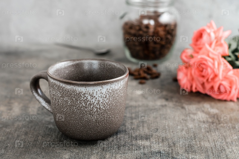 Пустая керамическая кофейная чашка, банка кофейных зерен и букет роз на столе
