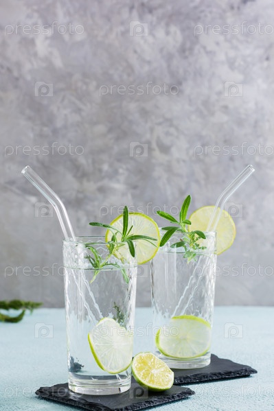 Детокс-пить воду с лаймом и розмарином в стаканах с эко-соломой на столе. Вертикальный вид