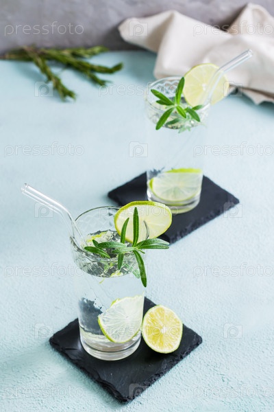 Освежающий напиток минеральной воды с лаймом и розмарином в стаканах с эко-соломой. Вертикальный вид