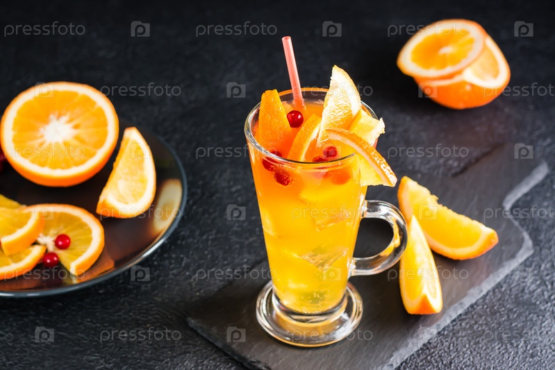 Апельсиновый клюквенный шипучий коктейль в стакане и фрукты и ягоды рядом на доске на темном фоне. Домашний безалкогольный коктейль