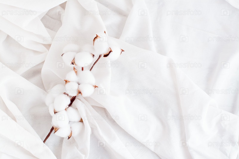 Ветка хлопка на белой ткани. Концепция белого на белом. Домашний интерьер. Вид сверху