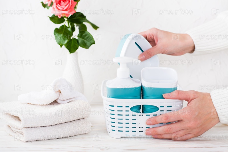 Женские руки кладут аксессуары для ванной в корзину и стопку полотенец на стол