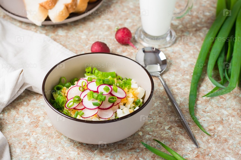 Нарезанные ингредиенты для окрошки в миске на столе. Русский традиционный холодный суп