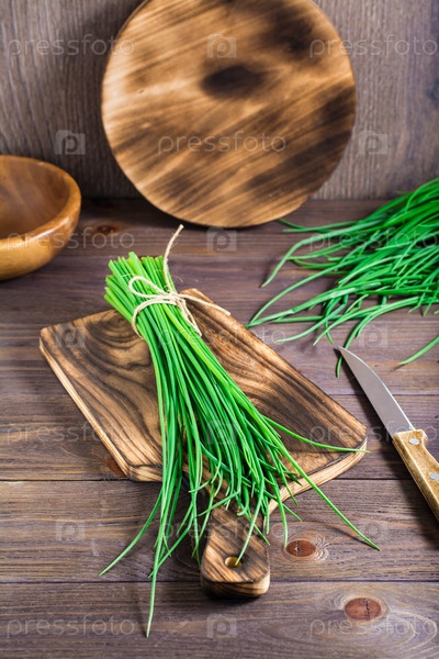 Куча свежего зеленого лука на разделочной доске на столе. Весенний сбор витаминов