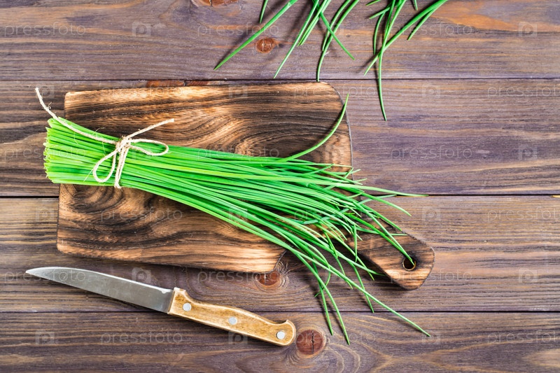 Куча свежего зеленого лука на разделочной доске на столе. Весенний сбор витаминов. Вид сверху