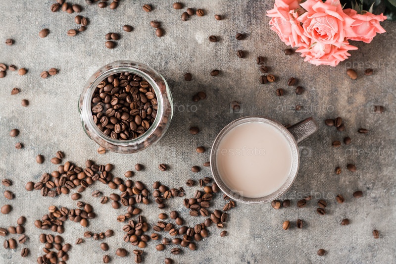 Латте в керамической чашке, банка с кофейными зернами и розами на столе. Вид сверху