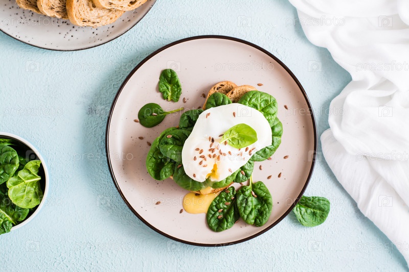 Аппетитный бутерброд с яйцом-пашот, шпинатом и семенами льна на тарелке. Флексетарианская диета. Вид сверху