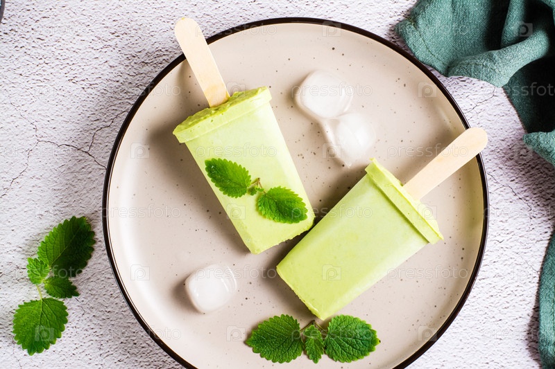 Вегетарианское эскимо из чая маття, кокосового молока и мяты на тарелке. Вид сверху. Крупный план