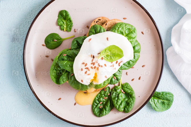 Аппетитный бутерброд с яйцом-пашот и шпинатом на тарелке. Флексетарианская диета. Вид сверху. Крупный план
