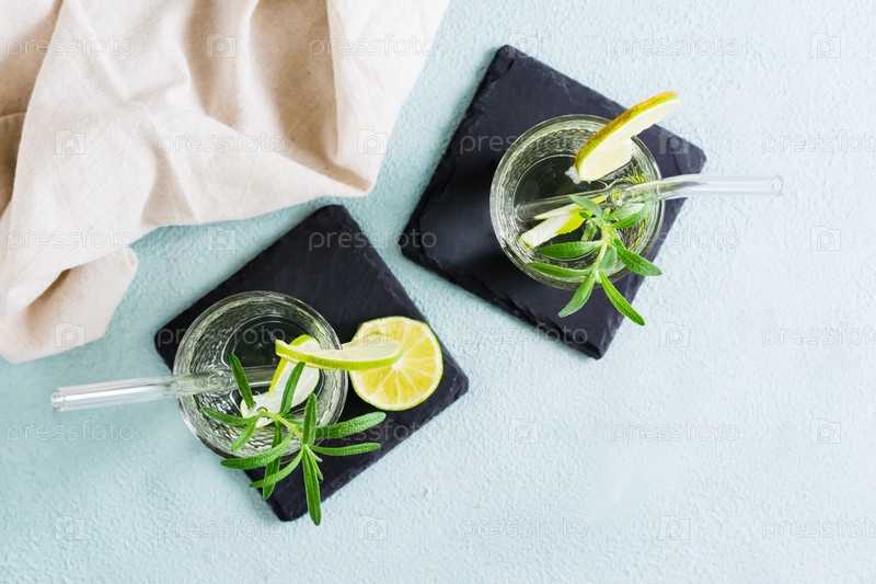 Детокс-пить воду с лаймом и розмарином в стаканах с эко-соломой на столе. Вид сверху
